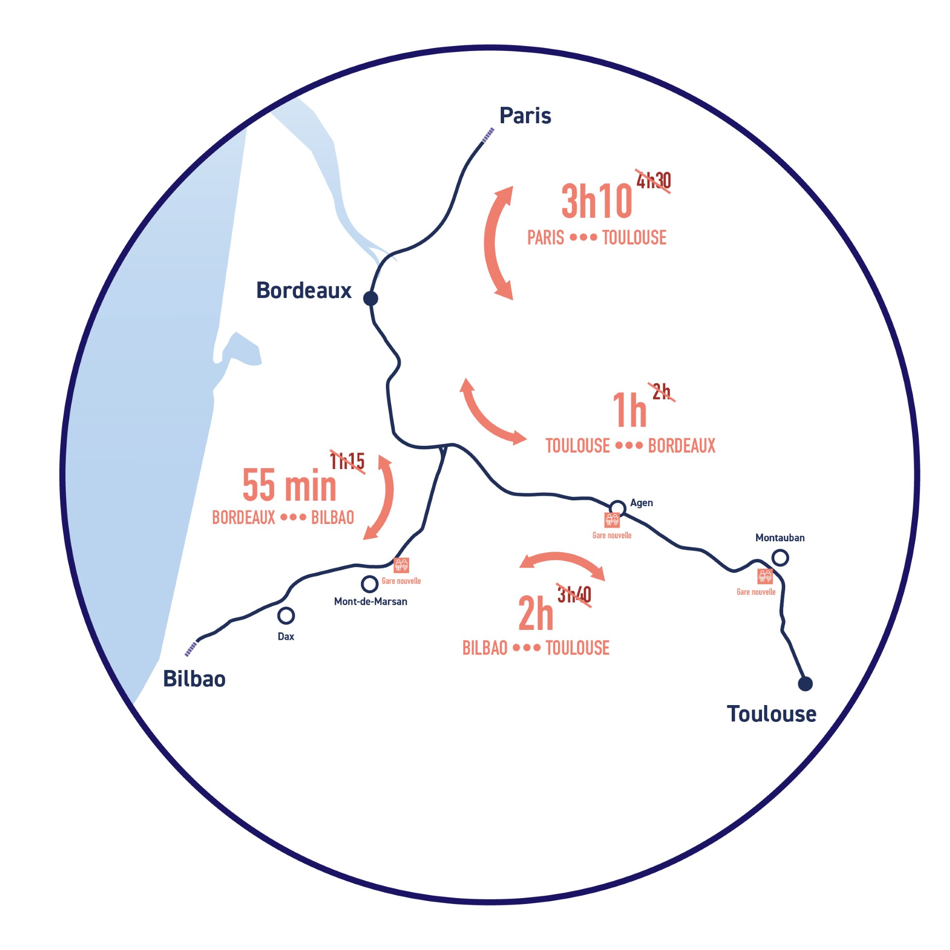 La LNSO réduit les temps de trajet entre les villes du Sud-Ouest, moyennes ou grandes, ainsi qu’avec Paris et l’Europe. Par exemple :